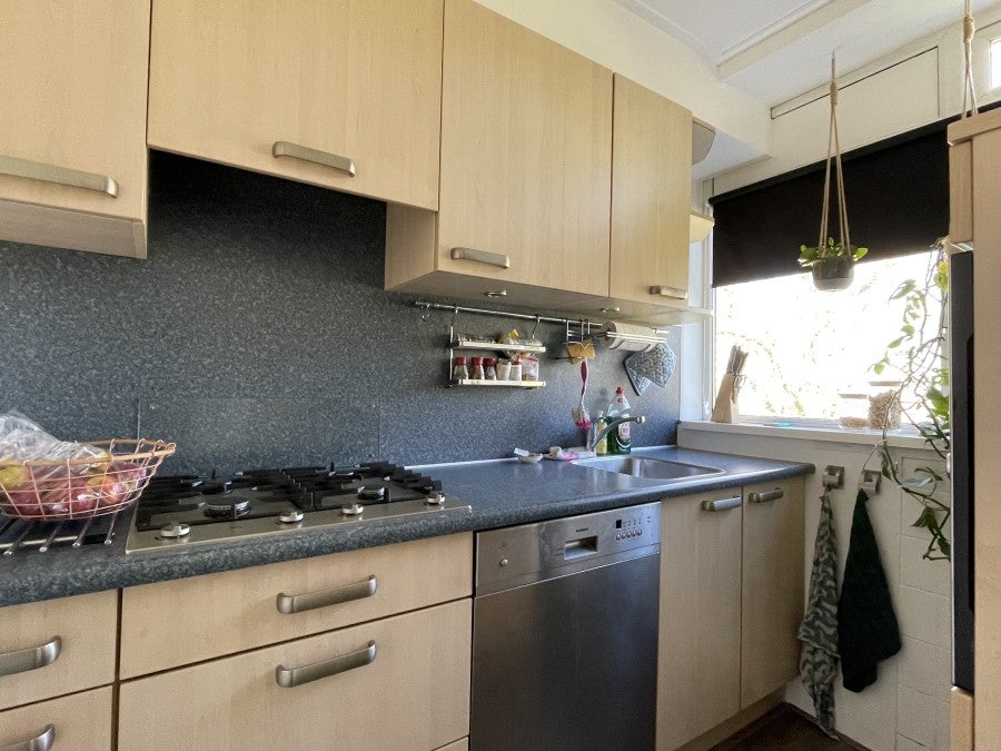De keuken, gelegen aan de voorzijde van de woning, is compleet uitgerust met een gaskookplaat, afzuigkap, koelkast met vriesvak, vaatwasser, combi-oven en een praktische inbouwkast met aansluitingen voor de wasmachine.