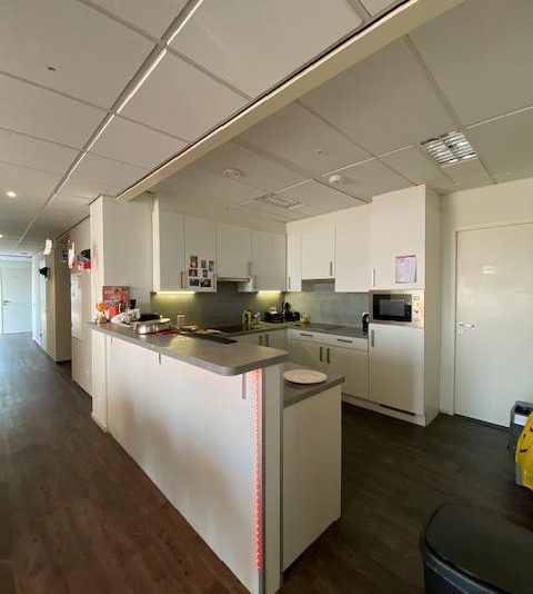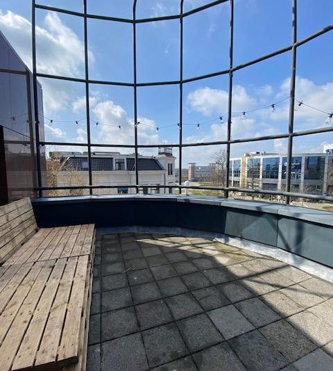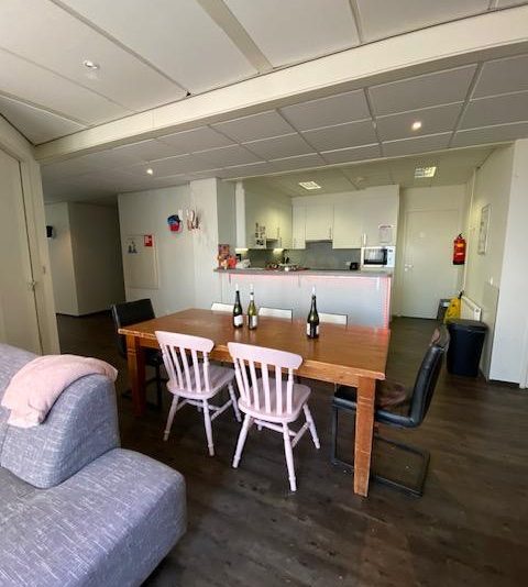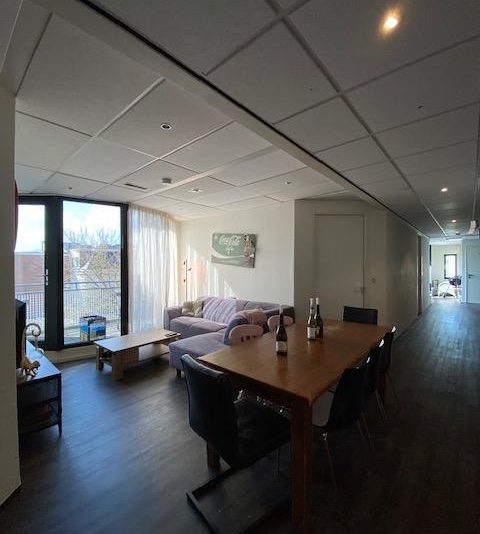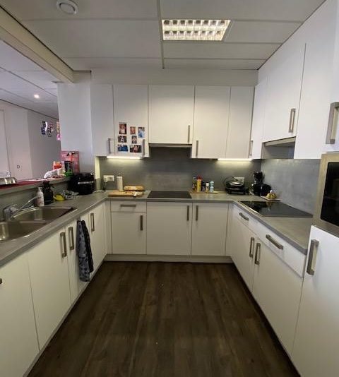Op de vierde verdieping van het pand komt een leuke kamer vrij van circa 19 m2. Je deelt de woning met 6 andere studenten: de woonkamer/keuken, badkamer/douches (2 douches), 2 toiletten, een wasmachine en droger en het dakterras + balkon op de 4e verdieping. De gezamenlijke keuken is voorzien van een vaatwasser, combi oven, 2 inductie kookplaten en een koelkast. In de gezamenlijke ruimtes worden de vloeren en de badkamer wekelijks schoongemaakt door een schoonmaakbedrijf.
