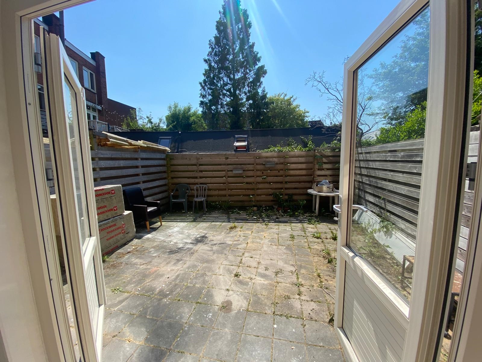 Je komt binnen in de gedeelde hal, vanwaar de woonkamer bereikbaar is. In de hal bevindt zich ook een apart toilet. De woonkamer biedt toegang tot de keuken en geeft daarnaast toegang tot de ruime achtertuin.