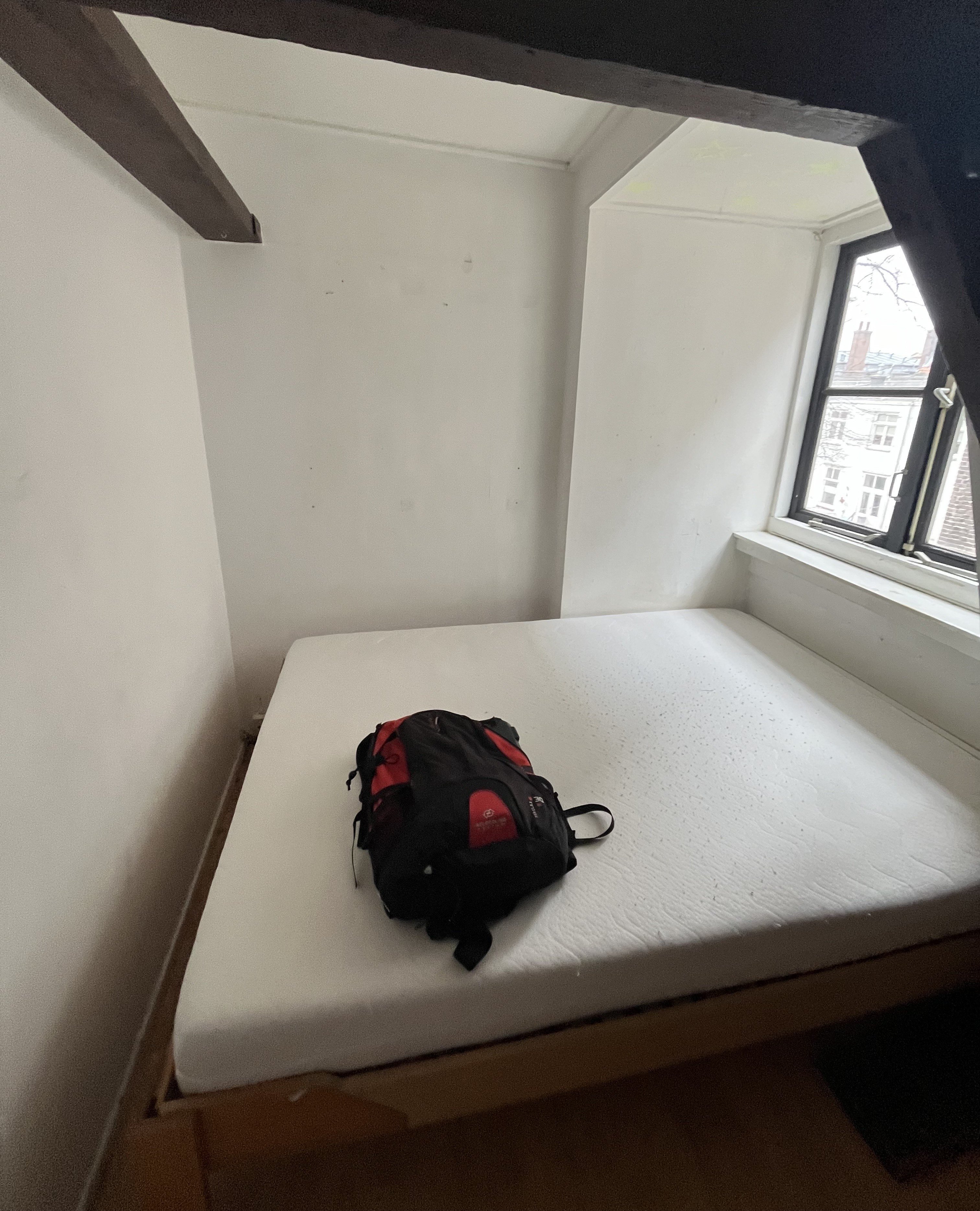 Een ruime L-vormige studentenkamer met eigen keukenblokje midden in het het centrum van Utrecht aan de Annastraat, gelegen op de derde verdieping aan de voorzijde.
